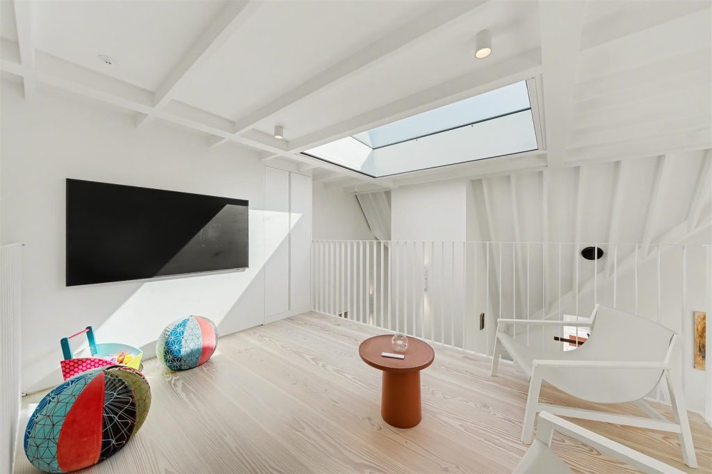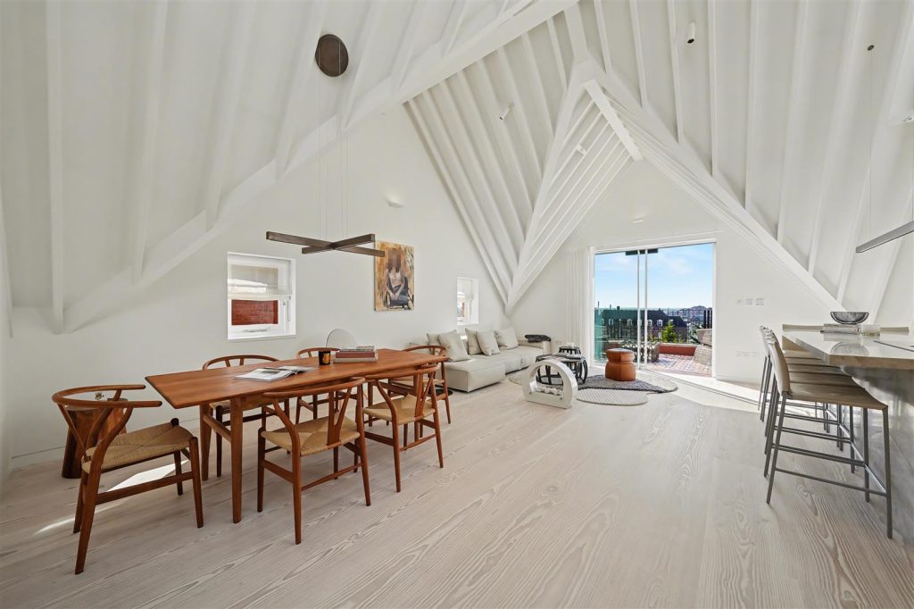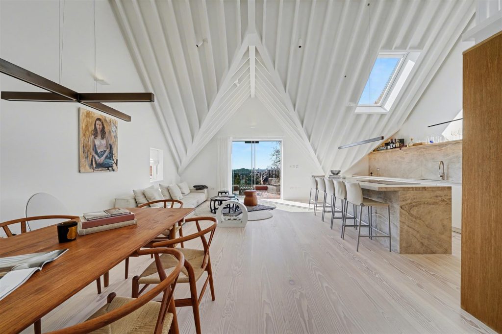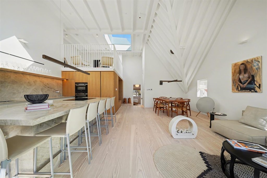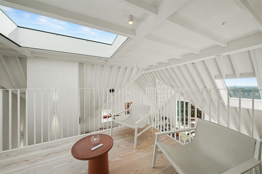 Architecturally designed, the apartment is defined by striking vaulted ceilings rising to approx. 4.8 meters, expansive skylights, and a well-conceived mezzanine level, ideal as a study or relaxation area enhancing space and perspective. Natural light floods the interiors throughout the day, amplifying openness and luxury.