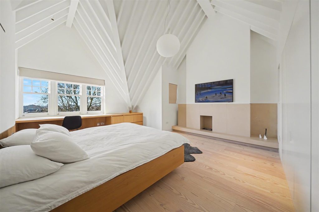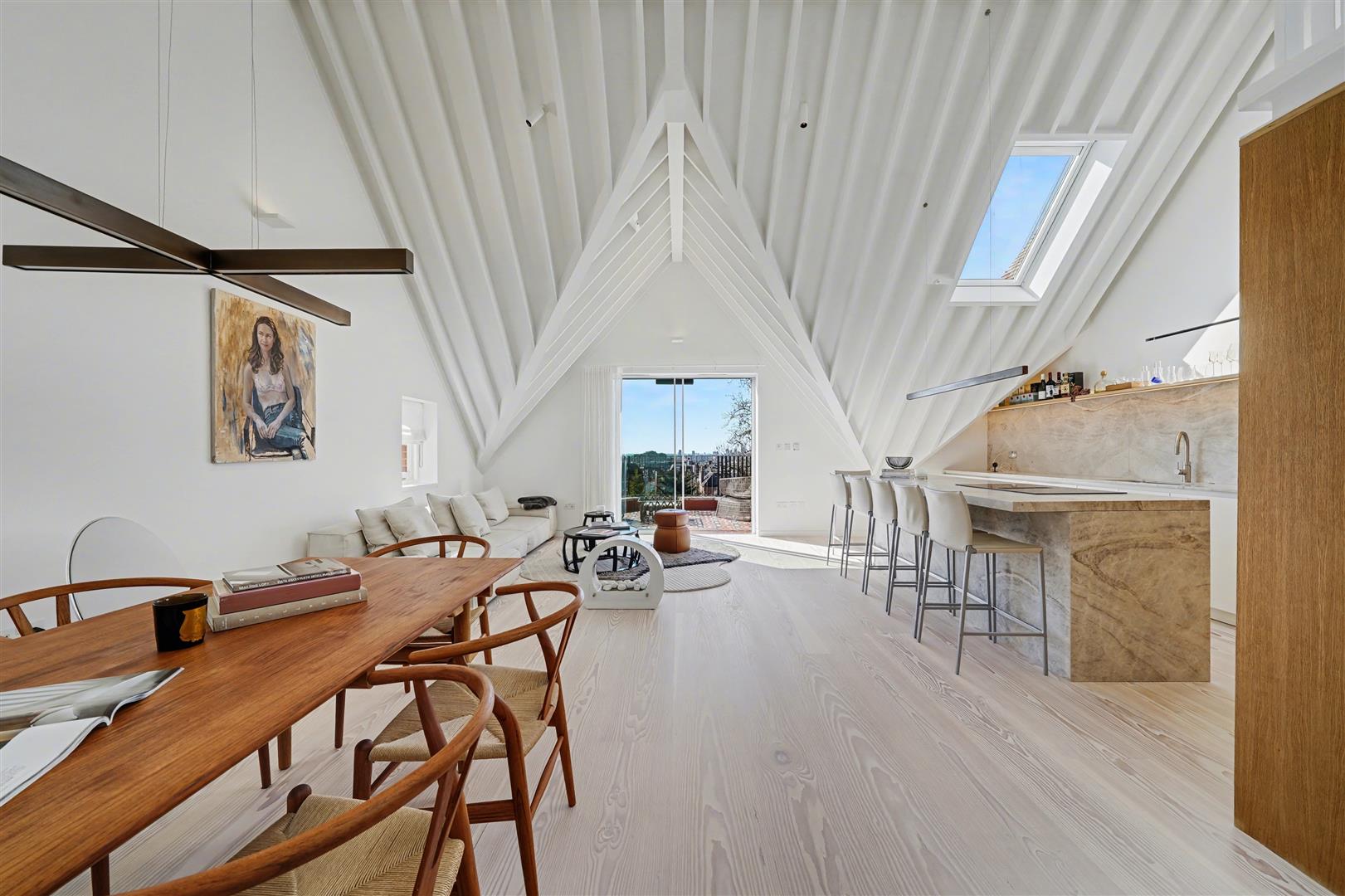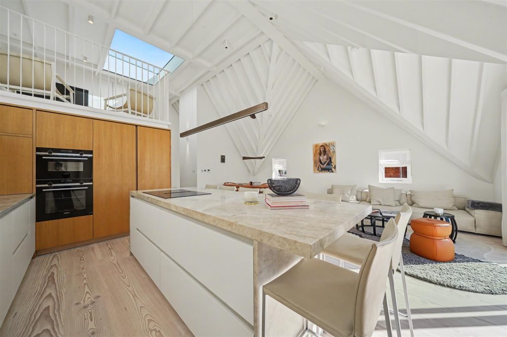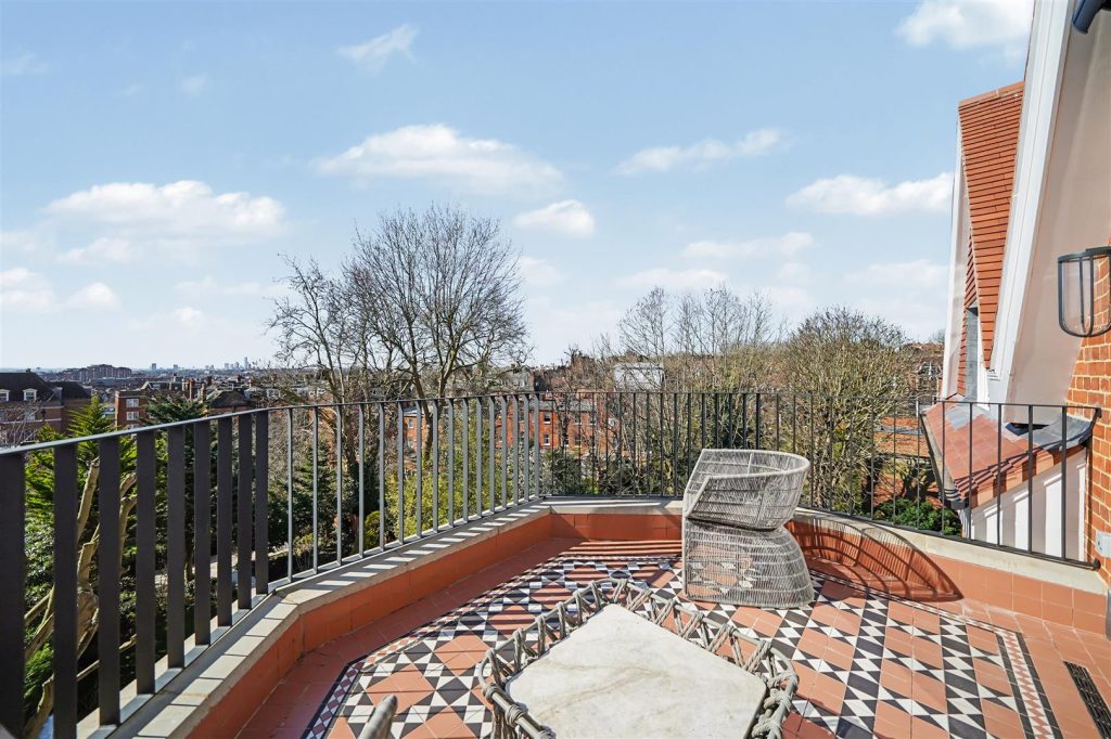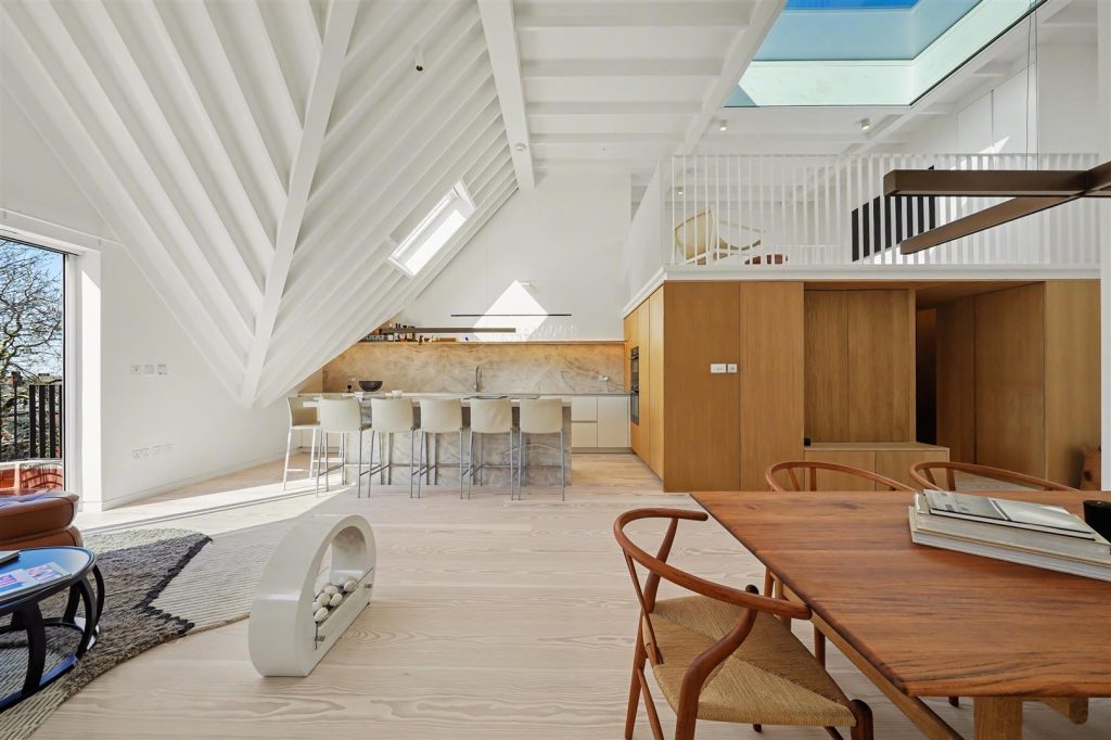 Positioned in a desirable Hampstead location, this exceptional three-bedroom penthouse occupies the top floor of a handsome detached residence, combining architectural drama with refined craftsmanship and panoramic London skyline views.