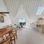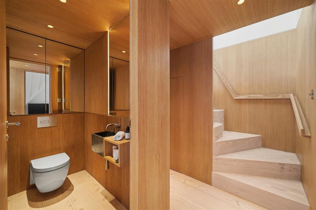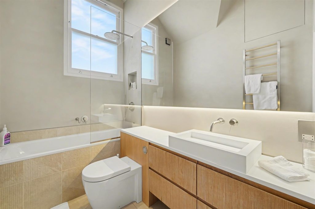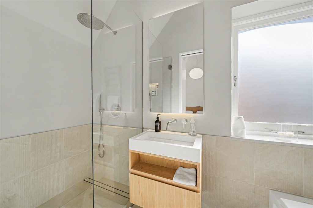 Accommodation comprises three beautifully appointed bedrooms, each with bespoke joinery, custom-built beds, and en-suite facilities, the principal suite with a full bathroom, and the two additional bedrooms with en-suite shower rooms. A separate guest WC adds convenience. Underfloor heating runs throughout, while the principal suite also benefits from air conditioning, ensuring year-round comfort.
