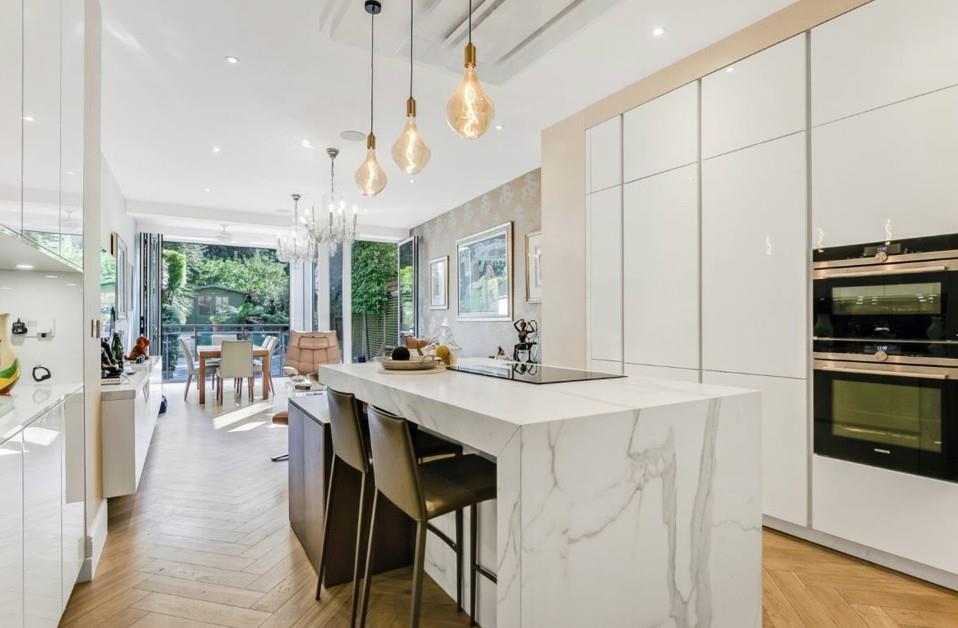 Meticulously renovated throughout, the property provides approximately 1,801 sq ft (167.3 sq m) of exceptional family accommodation. The apartment is centred around a striking 37-foot reception room featuring a bespoke Neil Lerner open-plan kitchen, which opens seamlessly onto the garden, creating an ideal space for both everyday living and entertaining.