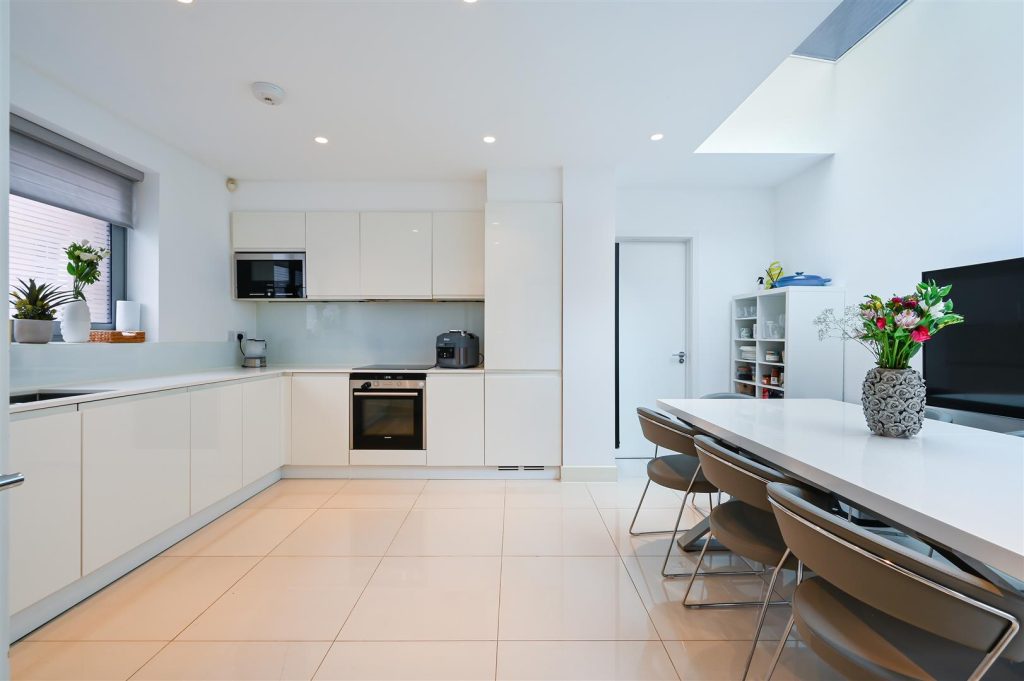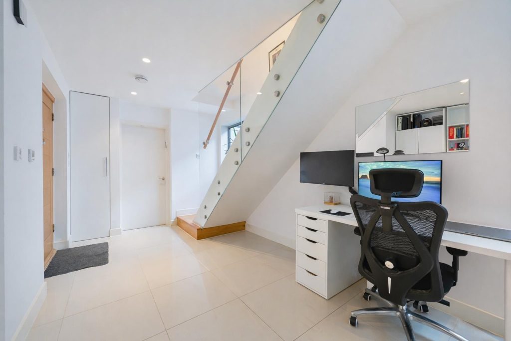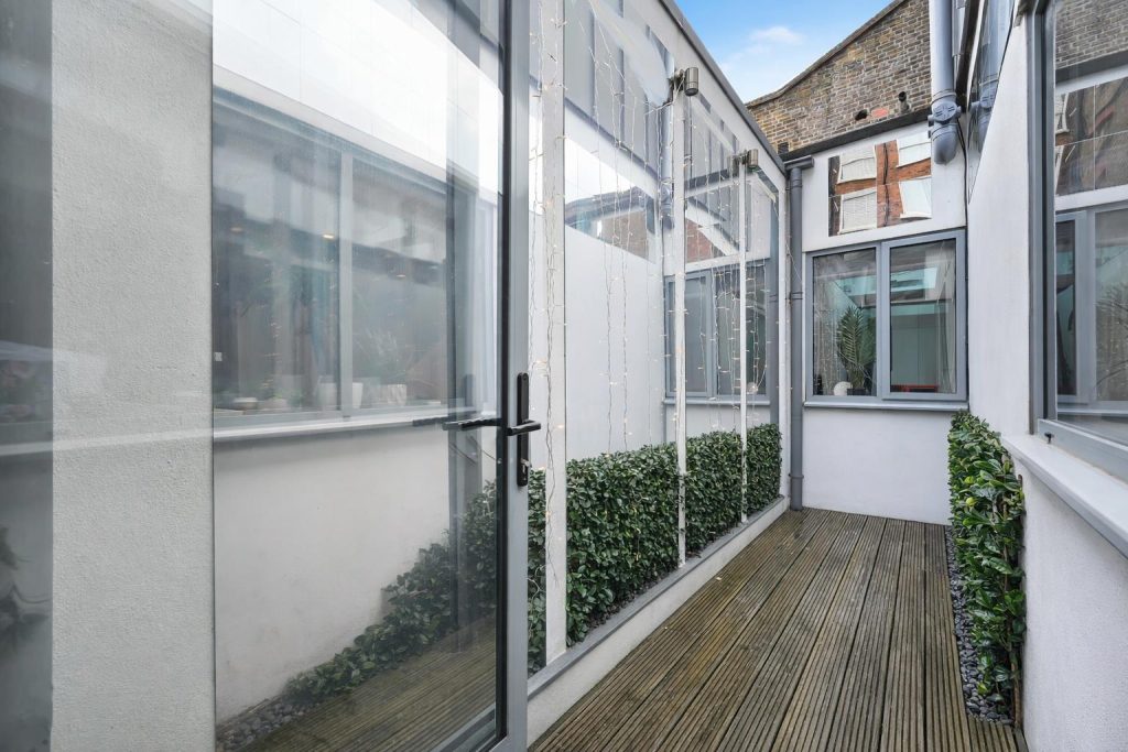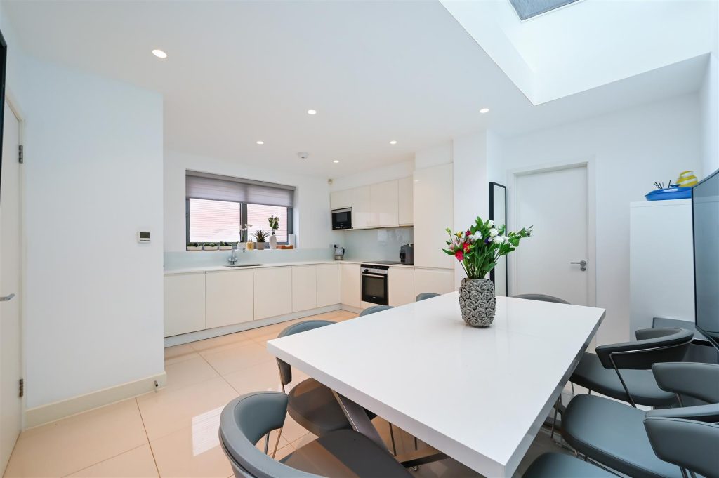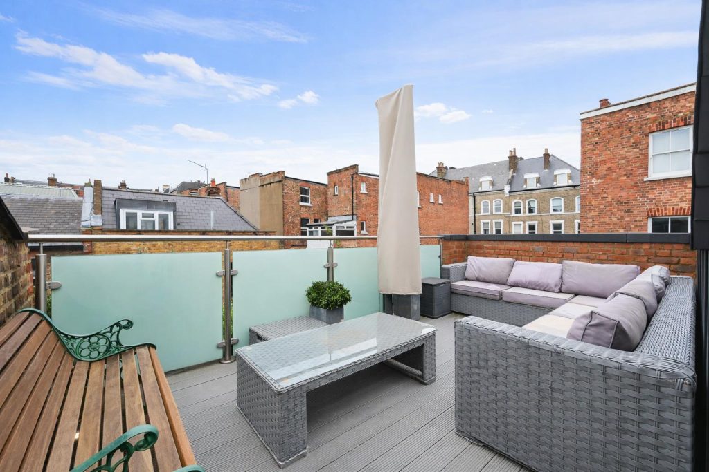 The upper floors host a superb principal bedroom with extensive bespoke built-in storage and en-suite shower room, a well-proportioned second double bedroom, a contemporary and a beautifully appointed family bathroom. The crowning feature is the magnificent private roof terrace, offering far-reaching views and an idyllic outdoor retreat.