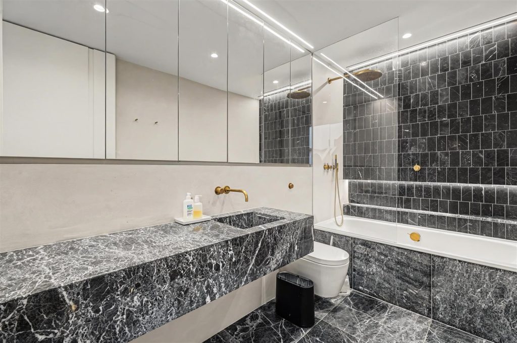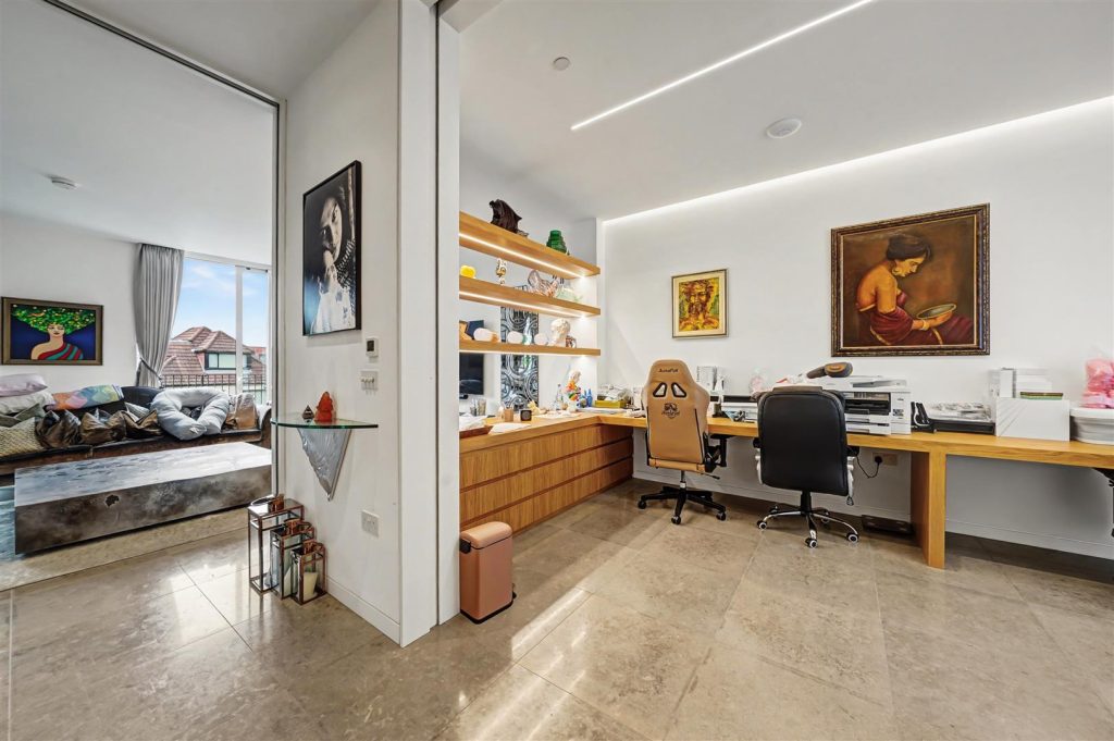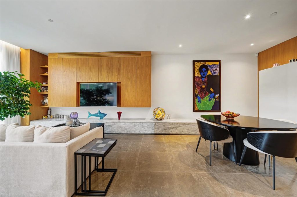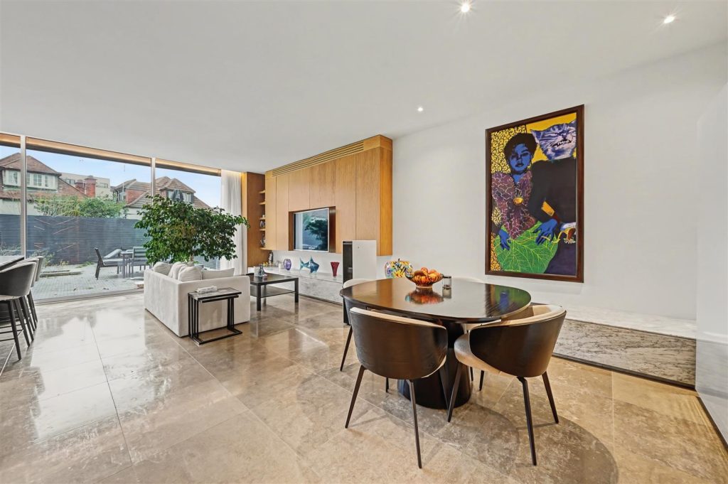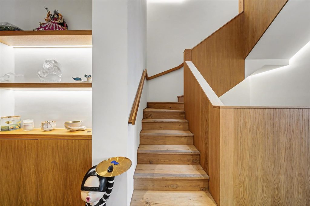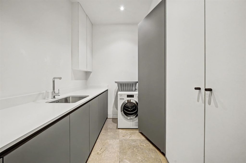 At the heart of the house is the garden level, featuring a bright and spacious open-plan family and dining area with a high-quality German kitchen fitted with Miele appliances. Doors open directly onto a private south-west facing garden, perfect for children, entertaining and outdoor dining. This floor also includes a large utility room, cloak storage and a guest WC.